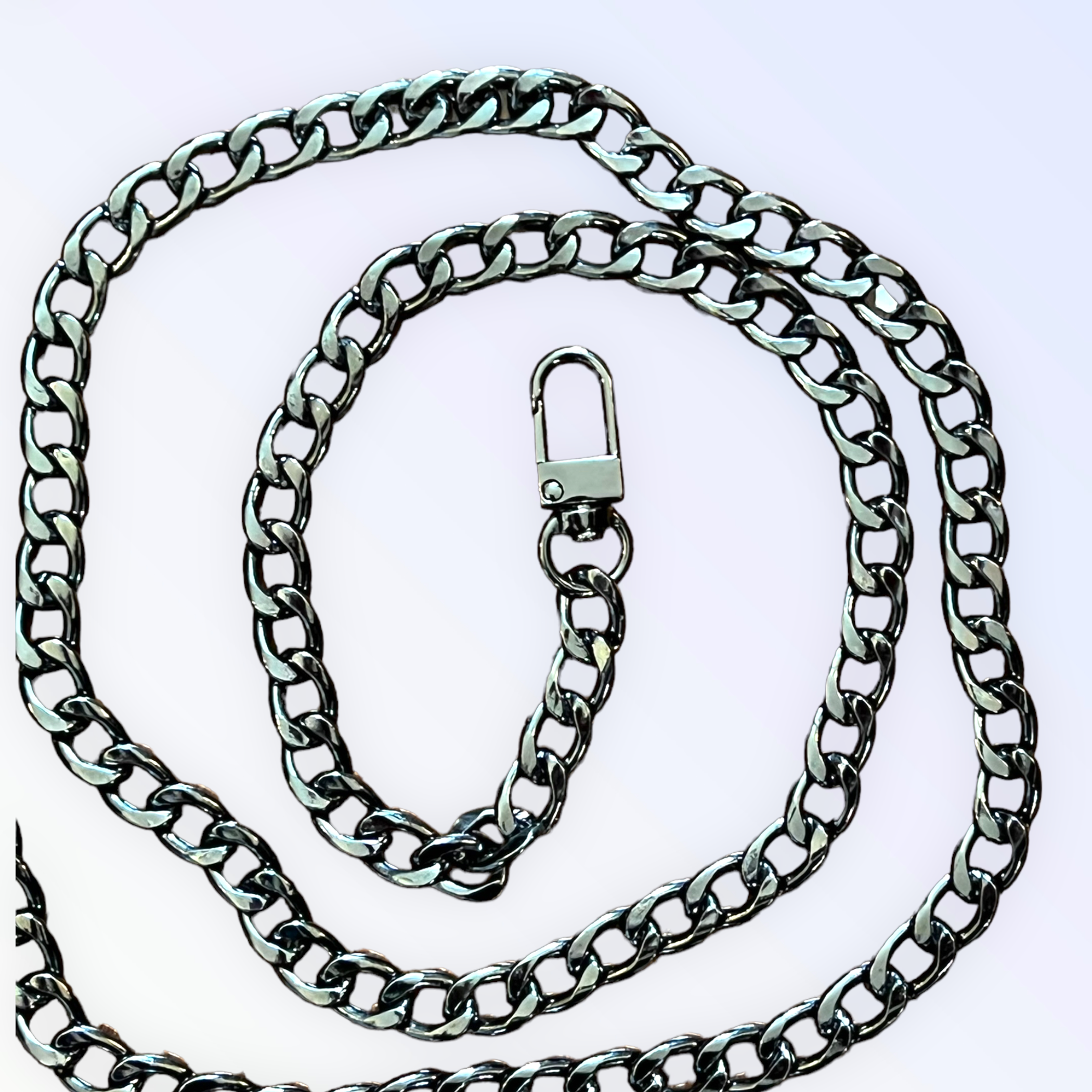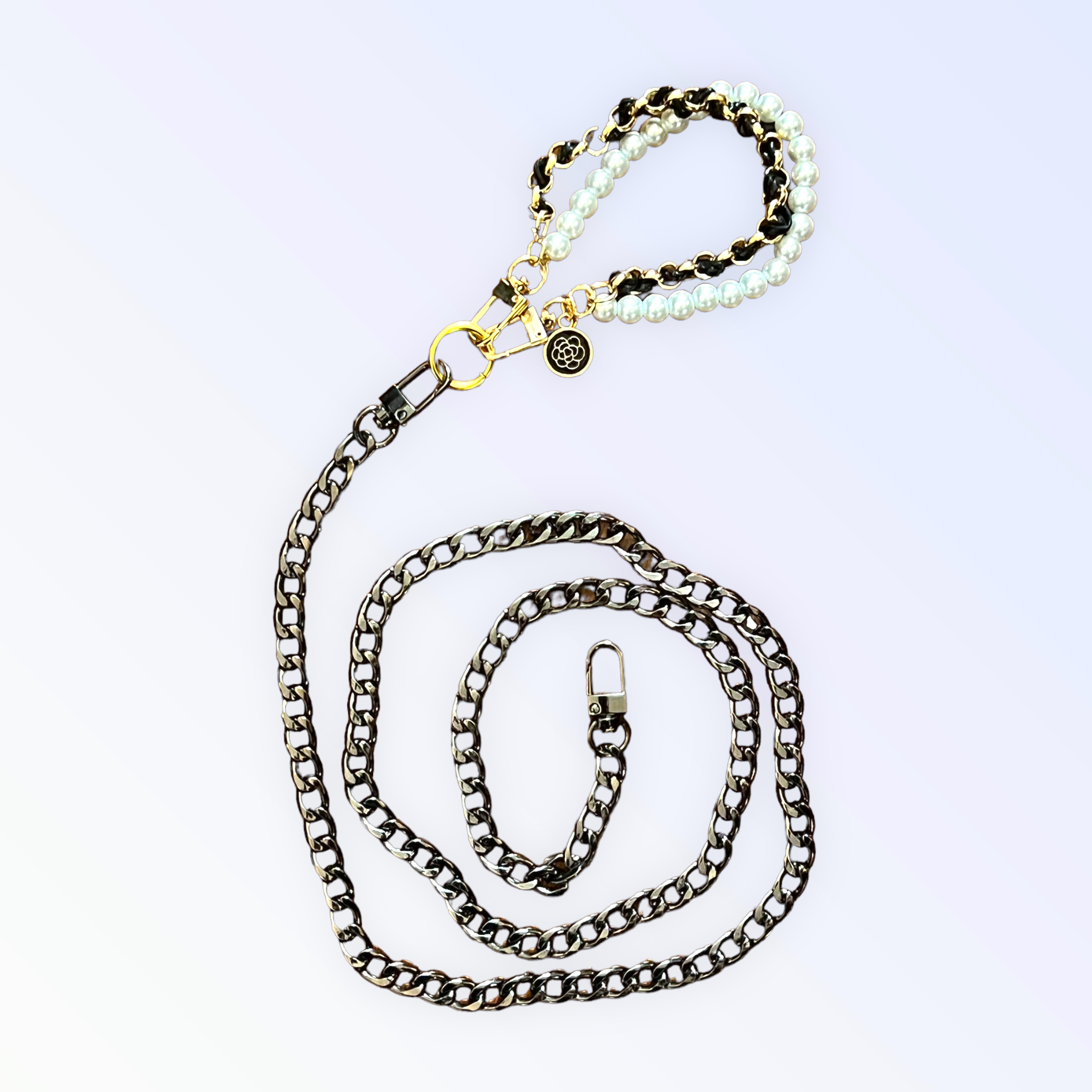 Take a stroll on our favorite Avenue! This gorgeous gunmetal leash has small thin oval-shaped links that connect together in a rotating position adding a hint of style and shape to otherwise flat pieces.Featuring a black pearl and leather chain handle/wristlet. 38" long